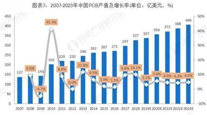 據Prismark預測,未來5年亞洲將繼續主導全球PCB市場的發展,而中國的核心地位更加穩固,中國大陸地區PCB行業將保持4.4%的復合增長率,至2023年行業總產值將達到405.56億美元。在PCB公司"大型化、集中化"趨勢下,已較早確立領先優勢的大型PCB公司將在未來全球市場競爭中取得較大優勢。